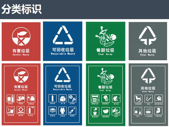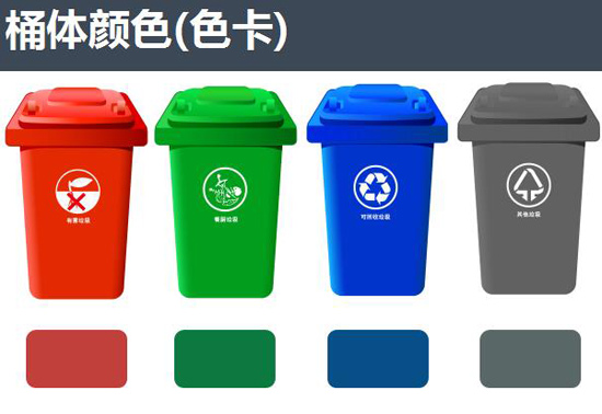 按照相關國家標準,《規范》將生活垃圾分為有害垃圾、可回收垃圾、餐廚垃圾、其他垃圾四類,在分類收集、運輸、處理生活垃圾的過程中均采用國標規定的分類垃圾桶與標志色。