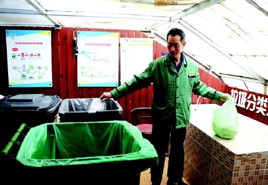 記者觀察時注意到,湛山小區9號樓前的垃圾桶垃圾分類做得非常好,綠色和灰色的垃圾袋分別都在各自的垃圾桶中,顯得井井有條。記者在9號樓居民鄒翠蓮家中看到,綠色垃圾桶就放在餐桌旁,上面還套著綠色的垃圾袋,方便就餐過程中扔廚余垃圾。而裝其它垃圾的灰色垃圾桶則放在陽臺上。?“將兩個垃圾桶分開放置,也是為了避免垃圾不分類亂扔。剛開始的時候,確實有些不適應,自己和家人還得繃著這根弦,想想什么垃圾放什么顏色的垃圾桶,現在我和家人早都養成習慣了,廚余垃圾扔餐桌旁的綠袋子,其它垃圾扔陽臺上的灰袋子。”83歲的鄒翠蓮說,垃圾分類就要從“源頭”開始,如果大家在家里不分好,環衛工人面對那么大的垃圾量很難再給分開。?