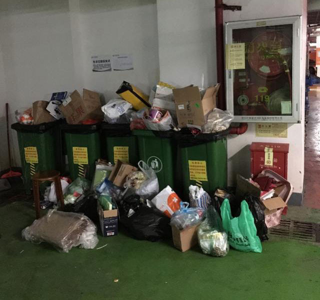 除了徐先生,住在龍華萊蒙水榭春天六期的業主朱先生告訴記者,自己的小區也在12月15日被撤桶了。小區有5棟,每棟31層,一共有155個垃圾桶。但朱先生告訴記者,撤桶后, “只有花園里的一排十幾個垃圾桶,根本不夠用”。水榭春天業主也一度將垃圾堆到物業管理處門口。“過了三四天,樓層垃圾桶就全部送回來了,可能是因為投訴太多了”。但朱先生和周邊樓盤的鄰居交流,金地梅隴鎮、1866、特發和平里等小區也都存在這樣的情況。