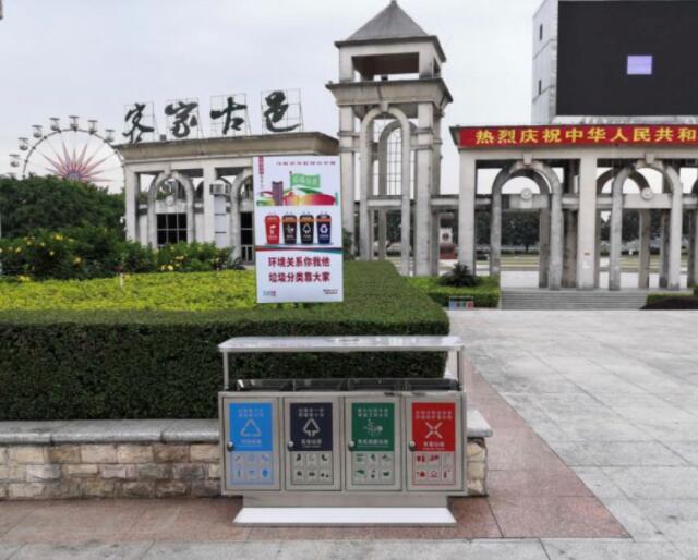 河源文化廣場,發現以往雙筒的垃圾桶被4種不一樣顏色的不銹鋼分類垃圾桶替代,垃圾桶上分別根據不同顏色印有不同標識,其中藍色桶印有可回收垃圾、黑色桶印有其他垃圾、綠色桶印有有機易腐垃圾、紅色桶印有有害垃圾,垃圾分類信息一目了然。