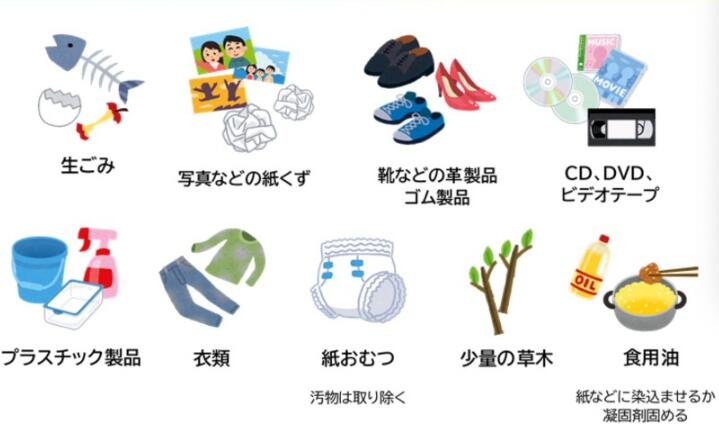 可燃垃圾有料理時產(chǎn)生的垃圾,照片紙屑,鞋子的橡膠制品的垃圾,CD磁帶等垃圾,塑料制品的垃圾,衣類垃圾,毛巾紙類垃圾,被食用油沾染的垃圾。