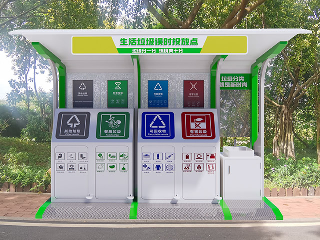 智能垃圾分揀房設有四個垃圾分類箱,分別為其他垃圾、廚余垃圾、可回收垃圾和有害垃圾。上面還設有大屏幕顯示屏,播放垃圾分類的宣傳視頻,可以有效地為居民提供垃圾分類知識。