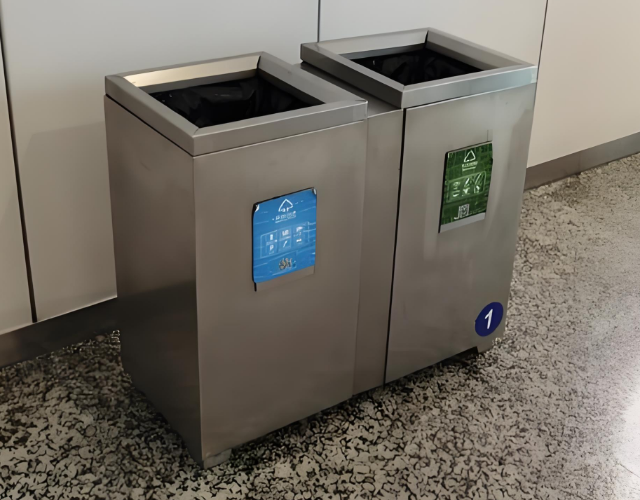 1.雙桶分區(qū):通過明確標(biāo)注“可回收物”與“其他垃圾”,引導(dǎo)乘客分類投放,助力城市垃圾分類政策的落地。部分定制方案還可增加“有害垃圾”獨(dú)立分隔倉。
