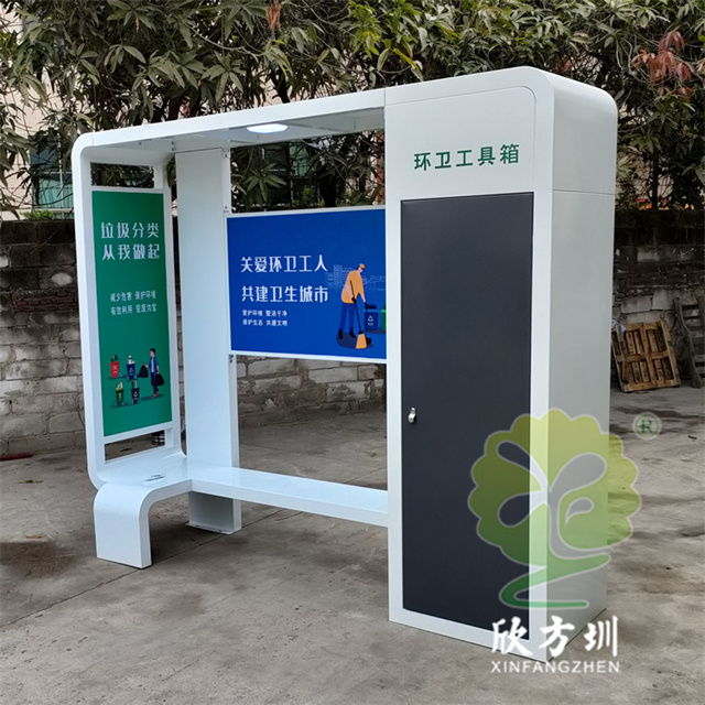 4、垃圾分類亭可開啟換畫面,前透明板材是耐力板,透明度高,耐勞防碎,不傷人,安全有保障。