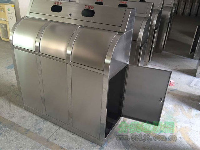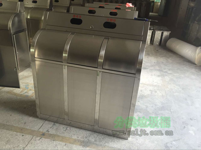 不銹鋼三分類垃圾桶工藝精湛,品質高檔,深受客戶好評。它采用優質不銹鋼板作為原材料,制作出來的垃圾桶堅固耐用,光滑不生銹。整個垃圾桶制作非常注重人性化的小細節,表角都作了折彎處理,沒有利角不割手,防止意外割傷。