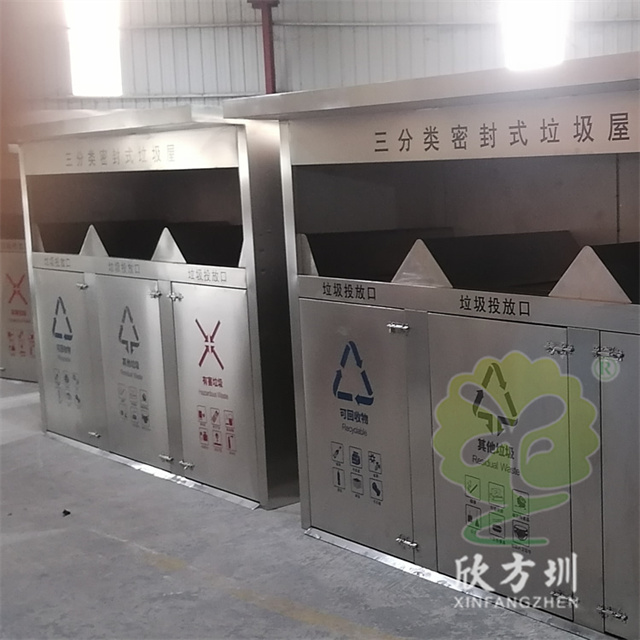 戶外城鎮密閉式三連體不銹鋼分類垃圾桶桶身采用優質 201#不銹鋼 1.0mm 厚度生產的,戶外連體三分類屋形設計,絲印單色的分類標識,可回收物藍色油墨,有害垃圾紅色油墨,其他垃圾黑色油墨,頂部和投口都采用了油墨絲印了黑色名稱標識,箱體不帶里面的塑料內筒,內筒是使用常規240L塑料垃圾桶。