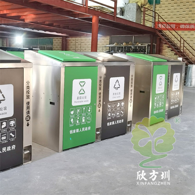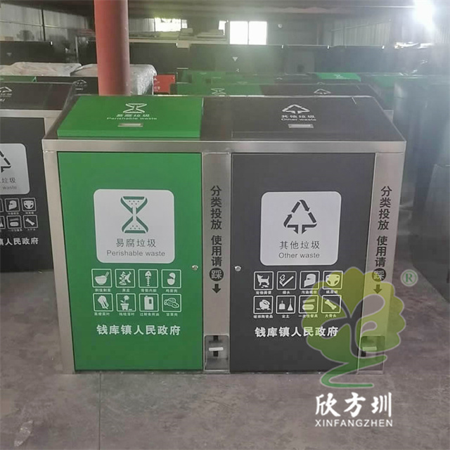 戶外小區腳踏式兩連體不銹鋼垃圾桶桶身優質201#不銹鋼足0.95mm厚度的板生產,框架不銹鋼本色,易腐垃圾門板和蓋子噴塑綠色,其他垃圾門板和蓋子噴塑黑色,蓋子帶嵌入式扣手,兩連體分類方形設計帶腳踏式,門板采用白色的油墨絲印了最新國標分類標識,腳踏式上方絲印了黑色文字指引。