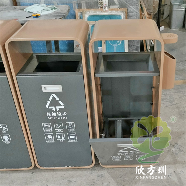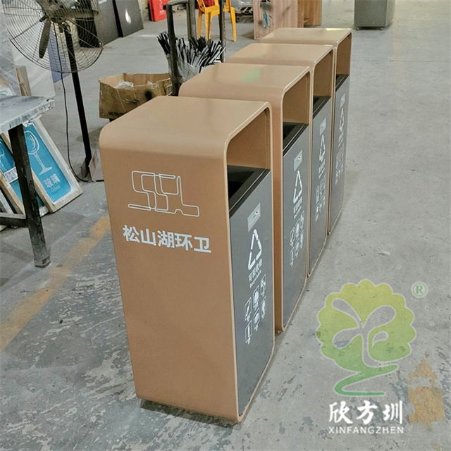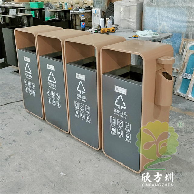廣東松山湖環衛不銹鋼分類垃圾桶外筒201不銹鋼1.2mm電鍍,內部噴粉烤漆,可以定做尺寸跟顏色,翻到方便清理桶內廢物,可以定制絲網印刷最新國標分類標識和企業logo,側面有一個煙灰盅,4個桶內部通過螺絲連接。