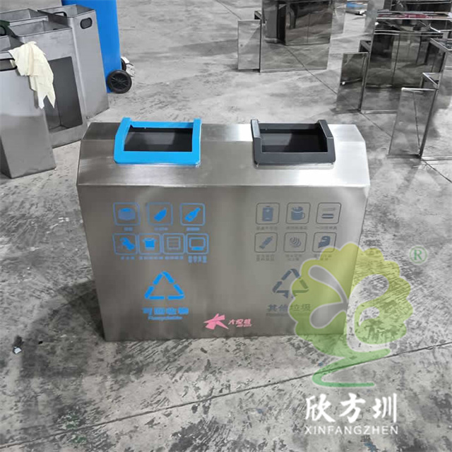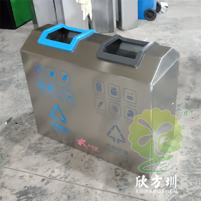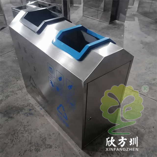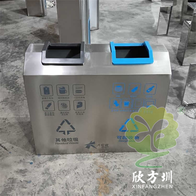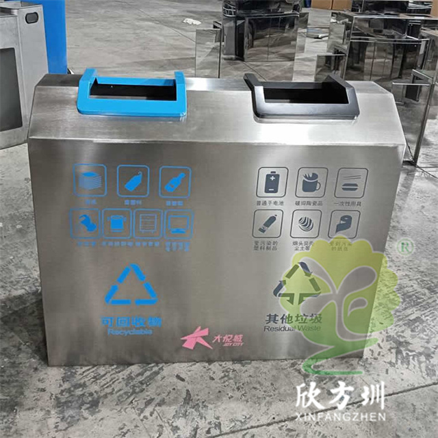 室內商用直投口不銹鋼分類垃圾桶采用201不銹鋼1.0mm厚的板制作,采用兩連體直投口方形設計,投口可回收物噴塑藍色其他垃圾投口噴塑黑色,正反面絲網印刷國標分類標識及企業logo,側面可以使用三角鑰匙開門取出內膽方便環衛工人清理廢物,欣方圳是一家專業定制戶外室內公共區域環衛垃圾桶的廠家。