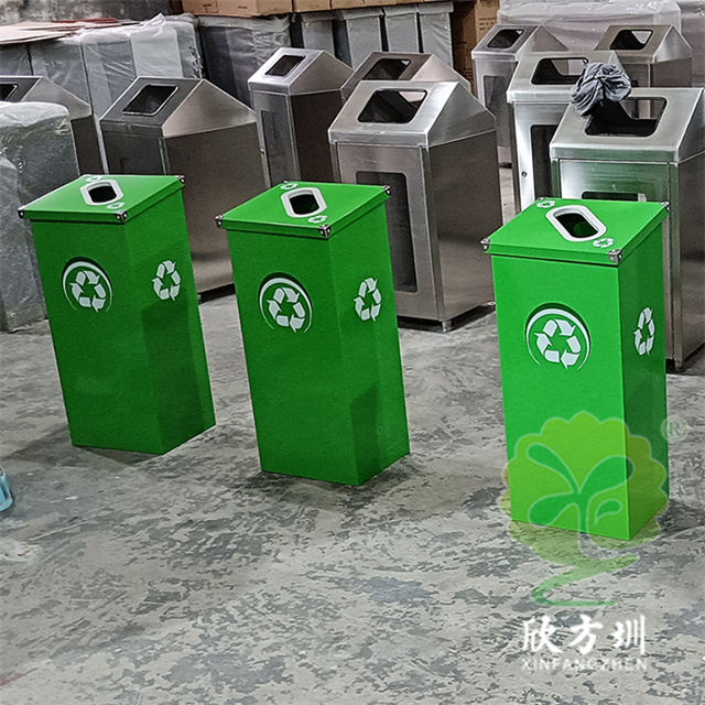 廣東烤漆三色不銹鋼分類垃圾桶投放點可以采用鍍鋅板、201/304不銹鋼制造,方形組合式立式直投口設計,噴粉烤漆綠色、藍色和咖啡色,投口圓形、橢圓形、方形開口,蓋子四角帶鉚釘裝飾,可以做固定支架,桶身正面和投口邊可以定制油墨絲網印刷中英文標識和人頭標。