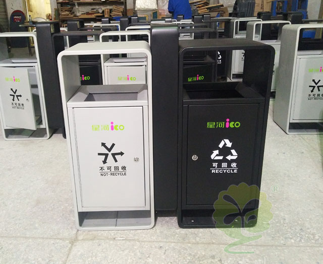 廣場鋼板烤漆分類垃圾桶采用優質冷軋鋼材料經激光切割剪鈑下料、折彎、沖壓、焊接、打磨、等工藝:表面經過除油、噴砂防銹處理后,再進行酸洗磷化處理;表面清理干燥后整體進行靜電噴涂或烤漆處理,靜電噴涂是經過流水線高溫固化爐固化后再出爐冷卻,加工后的塑粉附著力強,不易剝落,這樣戶外防銹效果才會好。