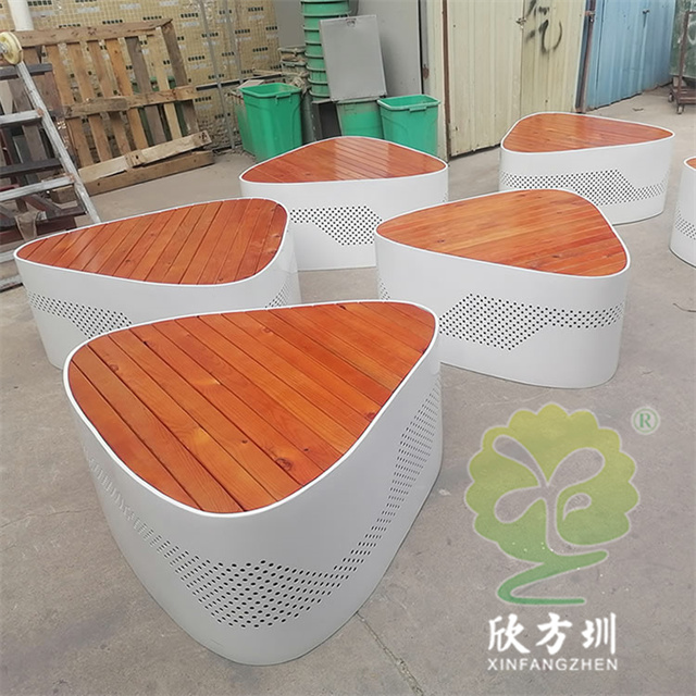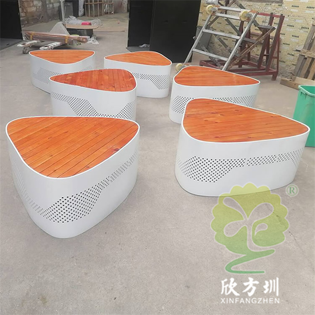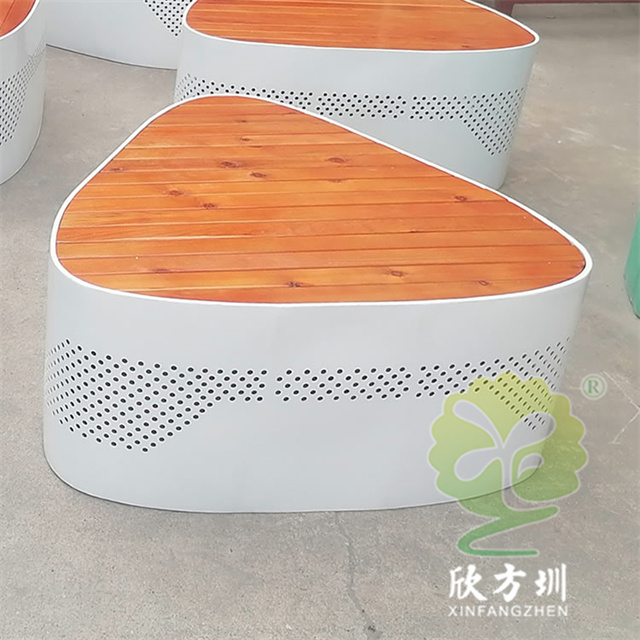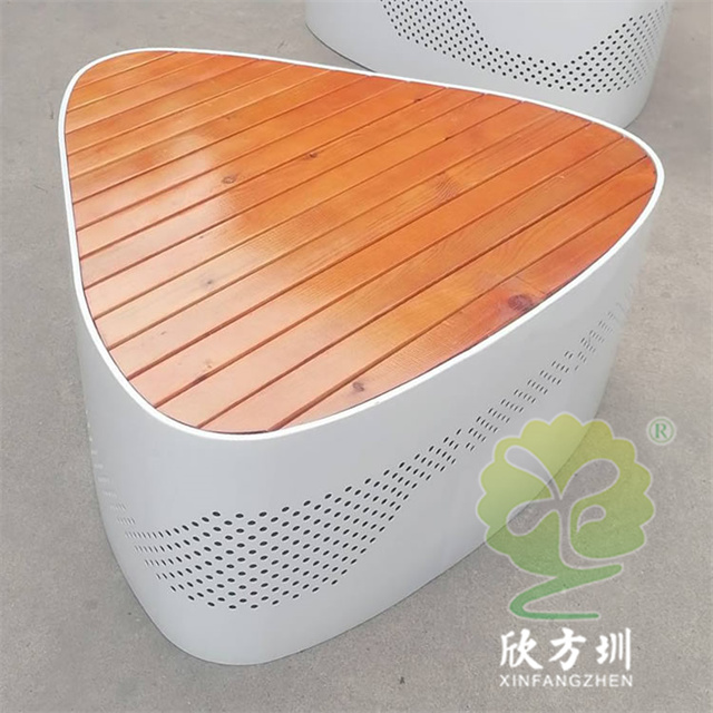 戶外三角形烤漆鏤空不銹鋼防腐木園林椅坐凳